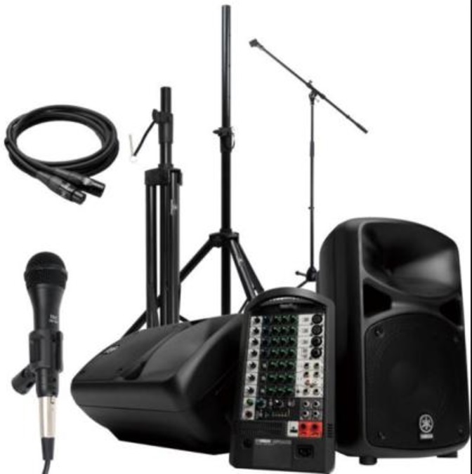 スピーカー、有線マイク、ワイヤレスハンドマイク、ピンマイク、マイクスタンド、CD再生、ipod・iphoneからの音楽データ再生可能